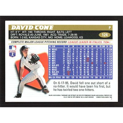 This is a 1996 Topps David Cone baseball card. The card is #124 and pictures show condition.
