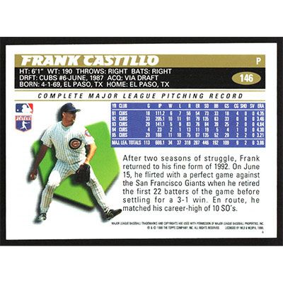This is a 1996 Topps Frank Castillo baseball card. The card is #146 and pictures show condition.