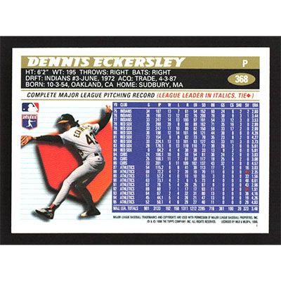 This is a 1996 Topps Dennis Eckersley baseball card. The card is #368 and pictures show condition.
