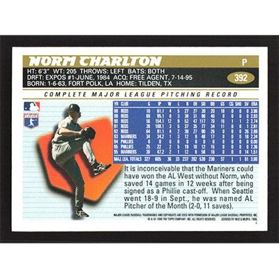 This is a 1996 Topps Norm Charlton baseball card. The card is #392 and pictures show condition.