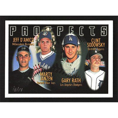 This is a 1996 Topps Jeff D'Amico, Marty Janzen, Gary Rath and Clint Sodowsky Propects baseball card. The card is #429 and pictures show condition.