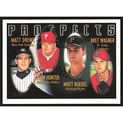 This is a 1996 Topps Matt Drews, Rich Hunter, Matt Ruebel and Bret Wagner Prospects baseball card. The card is #430 and pictures show condition.