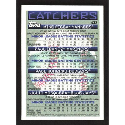 This is a 1996 Topps Mike Figga, Raul Ibanez, Paul Konerko and Julio Mosquera Prospects baseball card. The card is #432 and pictures show condition.