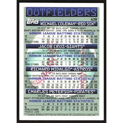 This is a 1996 Topps Michael Coleman, Jacob Cruz, Richard Hidalgo and Charles Peterson Prospects baseball card. The card is #438 and pictures show condition.