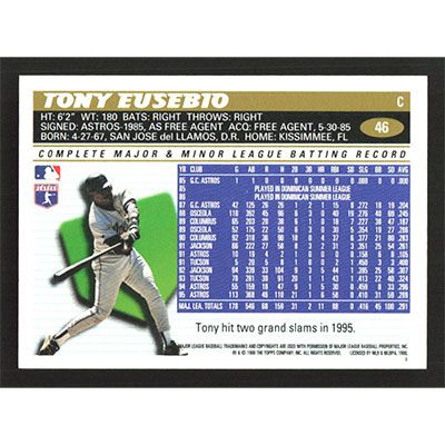 This is a 1996 Topps Tony Eusebio baseball card. The card is #46 and pictures show condition.