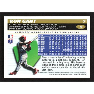 This is a 1996 Topps Ron Gant baseball card. The card is #70 and pictures show condition.