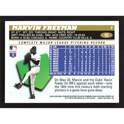 This is a 1996 Topps Marvin Freeman baseball card. The card is #93 and pictures show condition.
