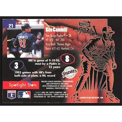 This is a 1996 Topps Laser Ken Caminiti baseball card. The card is #21 and pictures show condition.