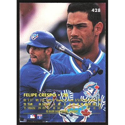 This is a 1996 Ultra Felipe Crespo baseball card. The card is #428 and pictures show condition.