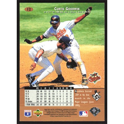 This is a 1996 Upper Deck Curtis Goodwin baseball card. The card is #12 and pictures show condition.