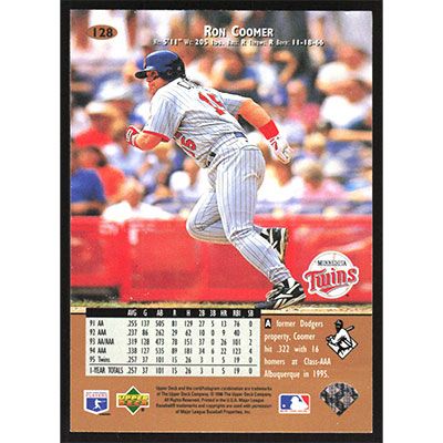 This is a 1996 Upper Deck Ron Coomer baseball card. The card is #128 and pictures show condition.