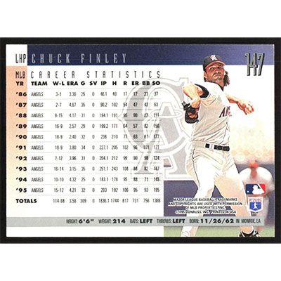 This is a 1996 Upper Deck Chuck Finley baseball card. The card is #147 and pictures show condition.