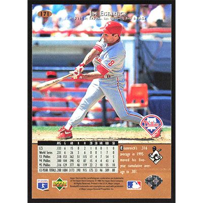 This is a 1996 Upper Deck Jim Eisenreich baseball card. The card is #171 and pictures show condition.