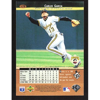 This is a 1996 Upper Deck Carlos Garcia baseball card. The card is #179 and pictures show condition.