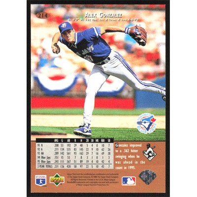 This is a 1996 Upper Deck Alex Gonzalez baseball card. The card is #214 and pictures show condition.