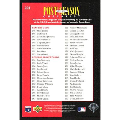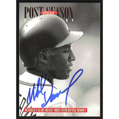 This is a 1996 Upper Deck Mike Devereaux Postseason Highlights Checklist autographed baseball card. This card has been signed, in blue, by Mike Devereaux, and is guaranteed authentic by Ballcardz.com. The card is #221 and pictures show condition.