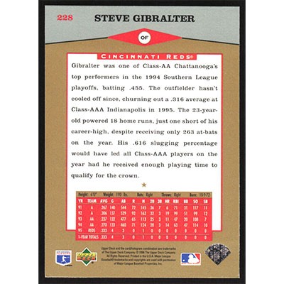 This is a 1996 Upper Deck Steve Gibralter Star Rookie baseball card. The card is #228 and pictures show condition.