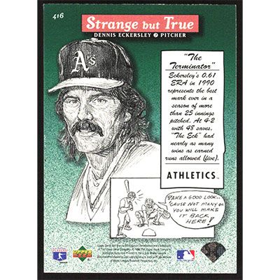 This is a 1996 Upper Deck Dennis Eckersley Strange but True baseball card. The card is #416 and pictures show condition.