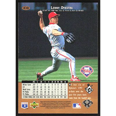 This is a 1996 Upper Deck Lenny Dykstra baseball card. The card is #430 and pictures show condition.