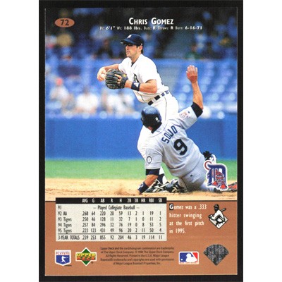 This is a 1996 Upper Deck Chris Gomez baseball card. The card is #72 and pictures show condition.