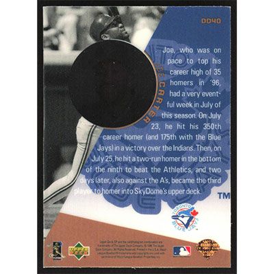 This is a 1996 Upper Deck Diamond Destiny Joe Carter baseball card. The card is #DD40 and pictures show condition.