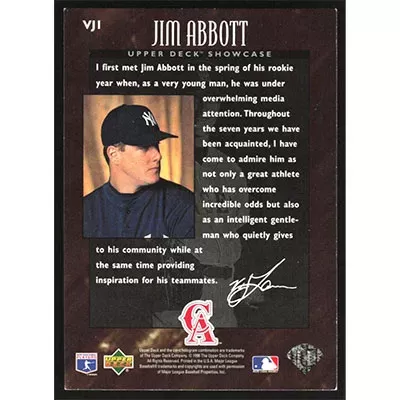 This is a 1996 Upper Deck V.J. Lovero Showcase Jim Abbott baseball card. The card is #VJ1 and pictures show condition.