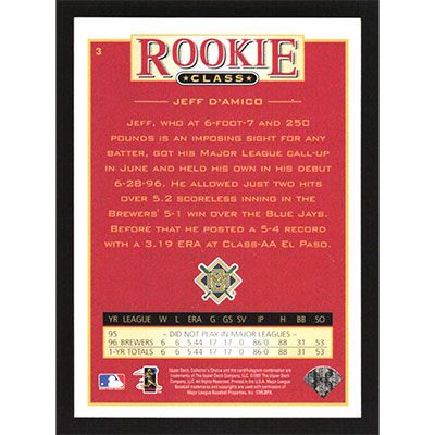 This is a 1997 Collector's Choice Jeff D'Amico Rookie Class baseball card. The card is #3 and pictures show condition.