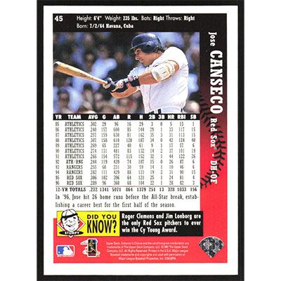 This is a 1997 Collector's Choice Jose Canseco baseball card. The card is #45 and pictures show condition.