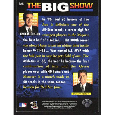This is a 1997 Collector's Choice The Big Show Jose Canseco baseball card. The card is #9 and pictures show condition.