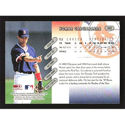 This is a 1997 Donruss Nomar Garciaparra baseball card. The card is #362 and pictures show condition.