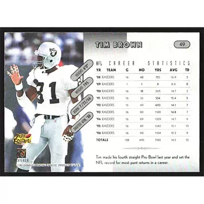 This is a 1997 Donruss Tim Brown football card. The card is #49 and pictures show condition.