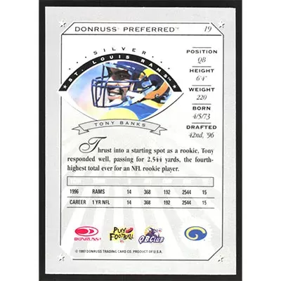 This is a 1997 Donruss Preferred Tony Banks Silver football card. The card is #19 and pictures show condition.