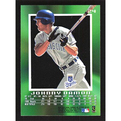 This is a 1997 E-X2000 Johnny Damon baseball card. The card is #24 and pictures show condition.