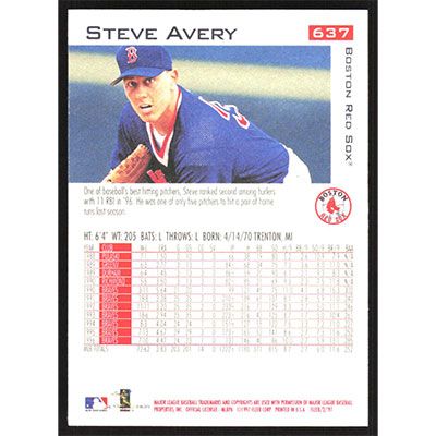 This is a 1997 Fleer Steve Avery baseball card. The card is #637 and pictures show condition.