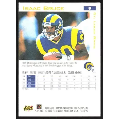 This is a 1997 Fleer Isaac Bruce football card. The card is #9 and pictures show condition.