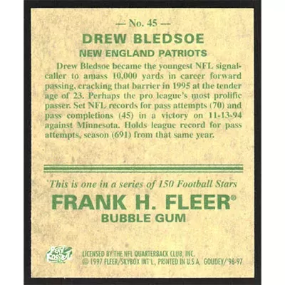 This is a 1997 Fleer Goudey Drew Bledsoe football card. The card is #45 and pictures show condition.
