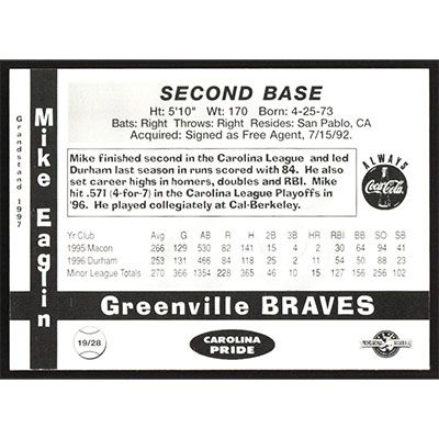 This is a 1997 Grandstand Mike Eaglin autographed baseball card. This card has been signed, in black, by Mike Eaglin, and is guaranteed authentic by Ballcardz.com. The card is #19 and pictures show condition.