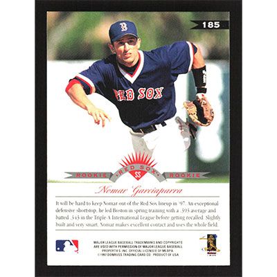 This is a 1997 Leaf Nomar Garciaparra baseball card. The card is #185 and pictures show condition.