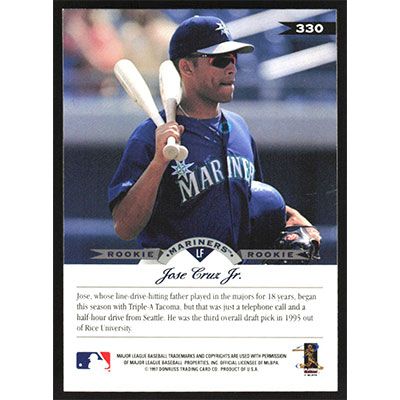 This is a 1997 Leaf Jose Cruz Jr. baseball card. The card is #330 and pictures show condition.