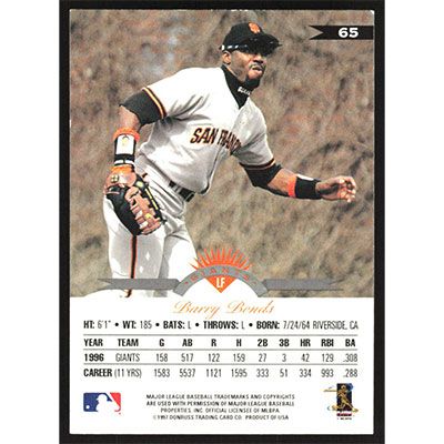 This is a 1997 Leaf Barry Bonds baseball card. The card is #65 and pictures show condition.