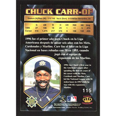 This is a 1997 Pacific Chuck Carr baseball card. The card is #115 and pictures show condition.