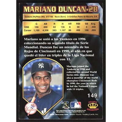 This is a 1997 Pacific Mariano Duncan baseball card. The card is #149 and pictures show condition.