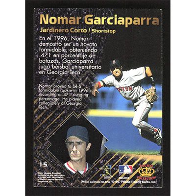 This is a 1997 Pacific Prisms Platinum Nomar Garciaparra baseball card. The card is #15 and pictures show condition.