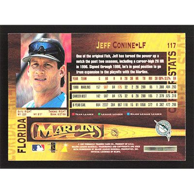 This is a 1997 Pinnacle Jeff Conine baseball card. The card is #117 and pictures show condition.