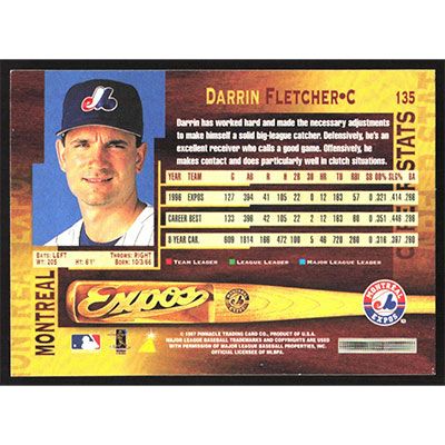 This is a 1997 Pinnacle Darrin Fletcher baseball card. The card is #135 and pictures show condition.