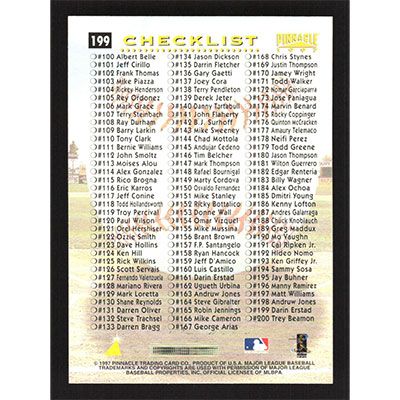 This is a 1997 Pinnacle Darin Erstad Checklist baseball card. The card is #199 and pictures show condition.