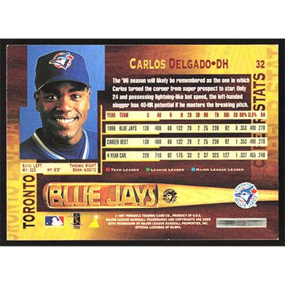 This is a 1997 Pinnacle Carlos Delgado baseball card. The card is #32 and pictures show condition.
