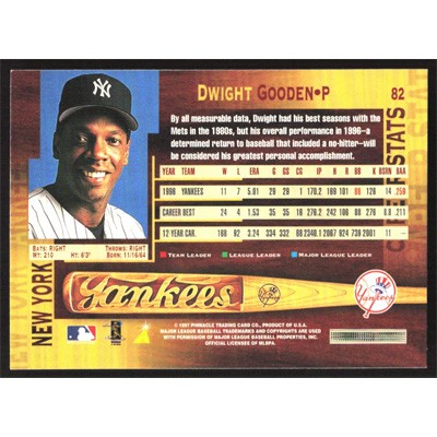 This is a 1997 Pinnacle Dwight Gooden baseball card. The card is #82 and pictures show condition.