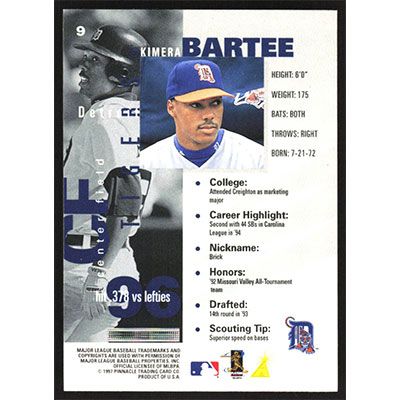 This is a 1997 Pinnacle Inside Kimera Bartee baseball card. The card is #9 and pictures show condition.