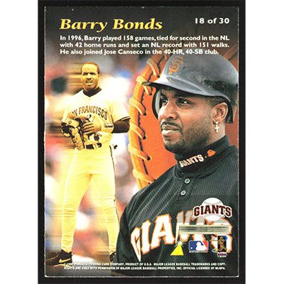This is a 1997 Pinnacle Mint Bronze Barry Bonds baseball card. The card is #18 and pictures show condition.